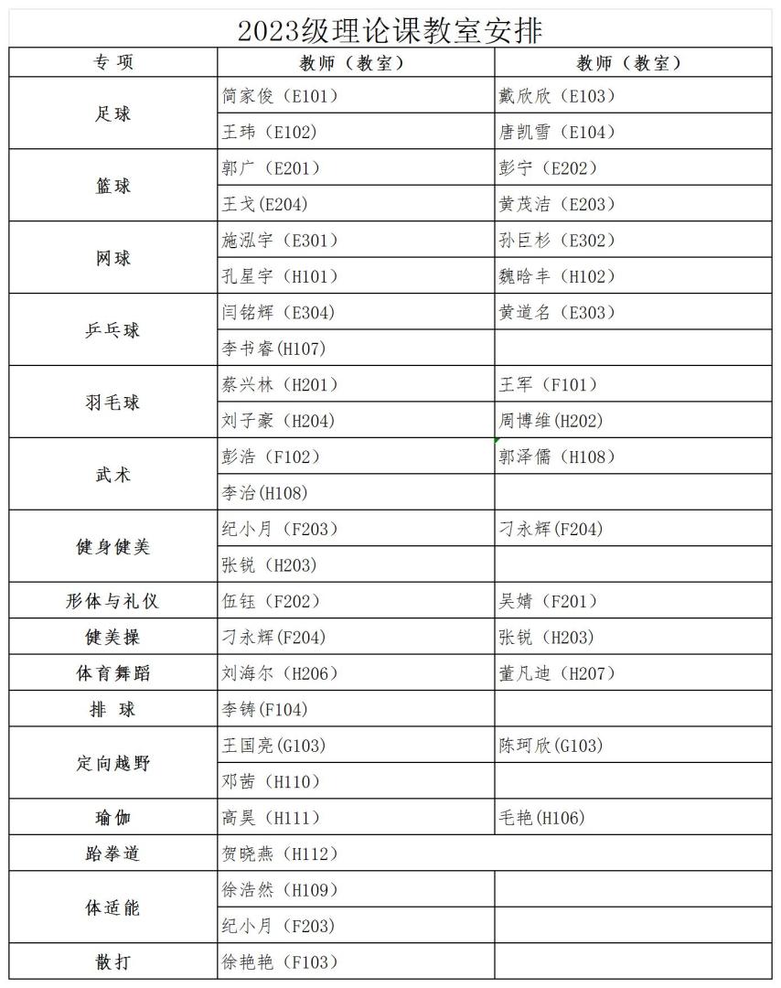 经教务处同意,本学期2023级本科生第3周体育课为九州平台(中国)理论课,10月7日起恢复户外教学。根据教室资源状况,现将理论课具体安排通知如下: